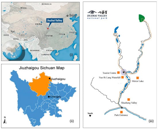 (i) The research site (Jiuzhaigou) in the map of China; (ii) The map of Jiuzhaigou; (iii) Data collection or sample areas inside the Jiuzhaigou; source: [85,97,98].