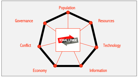 We live in “interesting times”, where such period refers to—as in the legendary Chinese curse—a time of danger, uncertainty, and complexity [21]. Unless the underlining drivers behind such dangers, uncertainties, and complexities are not eliminated or brought to a manageable level, these interesting times might coincide with the end of human civilization [22]. The primary underlining reasons—which are the key challenges of humanity today—include: (a) rapidly increasing global population; (b) rapidly depleting natural resources and climate change; (c) technological inequality and disruption; (d) misuse of data and information; (d) ruthless neoliberal economies; (e) global, regional, local conflicts; (f) corrupt or ineffective governance. These challenges are illustrated in Figure 1, and further elaborated below.