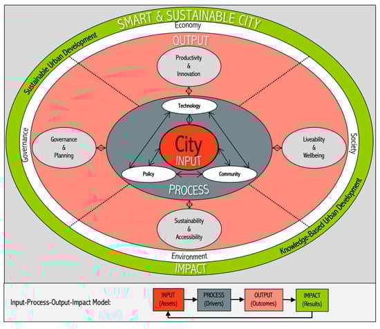 This conceptualization utilizes the Input-Process-Output-Impact approach [80]. As the key ‘input’, we have the city and its indigenous assets. By using this asset base, three ‘processes’—i.e., technology, policy, and community—generate strategies, actions, and initiatives. These result in ‘outputs’ in the economy, society, environment, and governance domains. When these outputs are aligned with knowledge-based and sustainable urban development goals, principles, and practices, they produce the desired ‘impact’ for a smart and sustainable city [79].