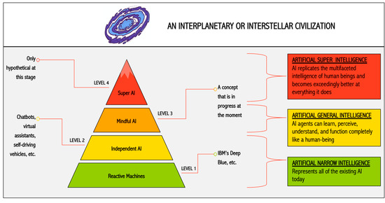 Mindful AIs, and artificial general intelligence more in general, are hypothetical stages of development, which could become the steppingstone to further technological progress in the field of AI. The ultimate level of AI that has so far been imagined is the ‘artificial super intelligence’. Here at the ‘Super AI’ level (Level 4), the AI does everything and anything better than us humans [100]. The opinions of scholars on superintelligence are mixed. While some believe that this could be mankind’s last invention leading to the end of human civilization, others posit that this technology could be the beginning of a new era as our only chance of leaving this planet and establishing an interplanetary or interstellar civilization [101,102,103].