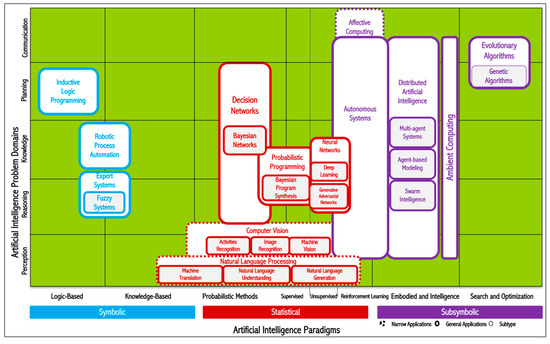 As urbanists interested in the present and near future of urban development, we deal with those existing technologies that are already in the process of altering the sustainability of cities. The rest of the viewpoint will, therefore, focus on artificial narrow intelligence. This vast field of AI includes technologies with at least one of the following capabilities: (a) perception including audio/visual/textual/tactile (e.g., face recognition); (b) decision-making (e.g., medical diagnosis systems); (c) prediction (e.g., weather forecast); (d) automatic knowledge extraction and pattern recognition (e.g., discovery of fake news); (e) interactive communication (e.g., social robots or chat bots); (f) logical reasoning and concept extraction (e.g., theory development from premises) [104]. Mapping out the state of the art in AI is highly useful to better understand the capacities and impact of artificial narrow intelligence. Figure 4 illustrates the key AI problem domains and paradigms.