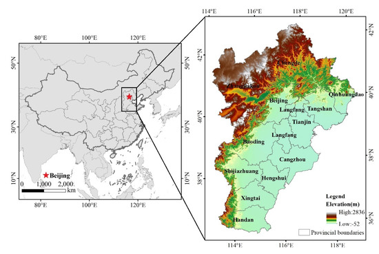 The BTH region—the Capital Economy Circle of China—lies between 36°03′–42°40′ N and 113°27′–119°50′ E in the North China Plain, with a total area of 218,000 km2. It includes two municipalities directly under the central government (i.e., Beijing and Tianjin) and 11 cities at prefecture level in Hebei Province (Figure 1). The elevation is higher to the northwest and lower to the southeast (Figure 1), and there are three major geomorphic units: Zhangjiakou Bashang Plateau, the Yanshan–Taihang Mountains, and Hebei Plain. The typical temperate monsoon climate in this region is characterized by high temperatures and rain in the summer, and coldness and dryness in the winter. There are various types of vegetation in the BTH region. Herbs dominate the grassland area in the northern plateau, and the main vegetation in the Yanshan–Taihang Mountains is shrubs and bushes. The vegetation types in the mountain basins in northwestern Hebei are mainly forests and shrubs. Most of the southern plains are cultivated land and artificial urban vegetation.