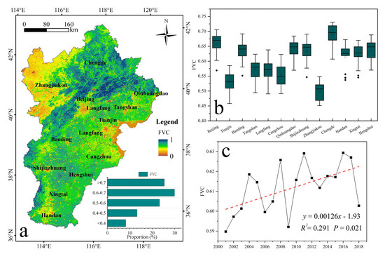 The fractional vegetation cover (FVC) in the BTH region: (a) the average FVC from 2001 to 2018; (b) box-plots of the average FVC of 13 cities from 2001 to 2018; and (c) the annual average FVC from 2001 to 2018.