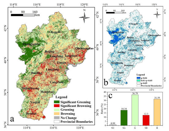Spatiotemporal variation of the FVC in the BTH region: (a) variation slope of FVC from 2001 to 2018; (b) the signification of the variation slope of the FVC; and (c) the proportion of different types of variation. No Change (NC), Significant Greening (SG), Greening (G), Significant Browning (SB), and Browning (B) refer to various vegetation variation types.