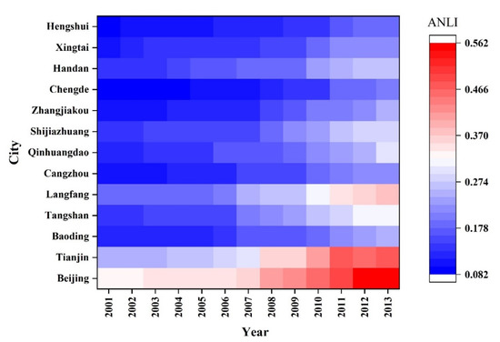 Annual ANLI of 13 cities in the BTH region from 2001 to 2013.
