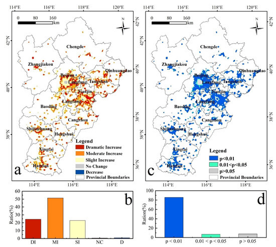 Spatiotemporal variation of the NTL in the BTH region: (a) the variation slope of the NTL from 2001 to 2013; (b) the proportion of the different types of NTL variation; (c) the signification of the variation slope of the NTL; (d) the proportion of the significance. Dramatic Increase (DI), Moderate Increase (MI), Slight Increase (SI), No Change (NC), and Decrease (D) refer to different types of NTL variation.