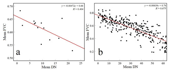The regression analysis results of the mean DN and FVC are shown in Figure 7. The regression results of the mean DN and FVC of the 13 cities and 300 sample points both demonstrate that the FVC had a negative correlation with the DN value in the BTH region, and the correlation coefficients were respectively 0.404 and 0.675. The results mean that areas with high NTL generally have low vegetation coverage. Because the NTL is a reflection of the urbanization degree in human social and economic activities, regional urbanization has a significant spatial correlation with vegetation degradation. That is to say, a higher intensity of human activities may worsen the condition of the vegetation.