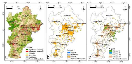 Spatiotemporal variation of the FVC and NTL in the BTH region: (a) the variation slope of the FVC from 2001 to 2013; (b) the variation slope of the NTL from 2001 to 2013; (c) the classification of the overlay results based on (a) and (b).