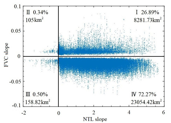 In order to make the time interval consistent, we calculated the FVC variation slope from 2001 to 2013. We overlaid the FVC slope and the NTL slope results of BTH to reveal the coupling relationship between the trends of the FVC and NTL of the BTH urban agglomeration. The results are shown in Figure 8, and are divided into four categories: Category I indicates that the vegetation coverage increased in the process of urban development; Category II indicates that the vegetation coverage increased to a certain extent while the city shrank; Category III refers to the destruction of vegetation and the decline of the vegetation coverage in the process of counter-urbanization; Category IV refers to the decrease of the vegetation coverage in the process of urbanization, considering that the area initially used for plant growth was occupied by construction land. According to the above classification, the grid data were statistically analyzed at the pixel scale (Figure 9). Due to the influence of outliers, the original statistical results made it difficult to show the partition. We thus excluded the exceptional values of two variables in order to show the distribution of the various pixels more intuitively.
