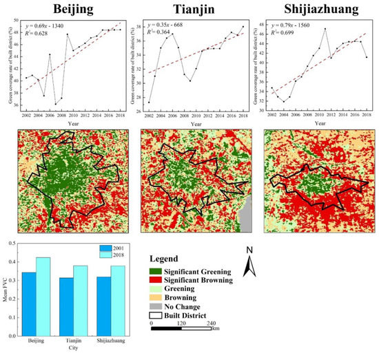 In this study, we chose Beijing, Tianjin, and Shijiazhuang as typical cities in order to analyze the relationship between vegetation coverage and the greening degree of built-up areas. According to the FVC trend graph of the BTH region, the urban core areas of the metropolises showed a definite ‘green’ trend from 2001 to 2018. We utilized the remote sensing monitoring data of land cover with a resolution of 30 m to obtain the built-up area range of the above three cities, and measured the mean FVC value of the built-up areas in 2001 and 2018. It was found that the average FVC value of the built districts in the three cities increased remarkably in the last 18 years. By referring to the China City Construction Statistical Yearbook from 2002 to 2018, we conducted a linear regression analysis of the green coverage in the built districts of Beijing, Tianjin, and Shijiazhuang, as shown in Figure 11. The green coverage of their built-up areas showed an apparent upward trend, which inferred that ‘urban greening’ had a positive effect on the greening of the vegetation coverage in the urban core areas. That is, in the highly urbanized areas, the relevance of the FVC variation trend and the urbanization level is positive, which is in agreement with previous studies [65]. It is due to the fact that metropolises can more easily be in pioneer positions to promote vegetation growth, especially in implementing advanced ecological restoration projects and advancing urban landscape planning.
