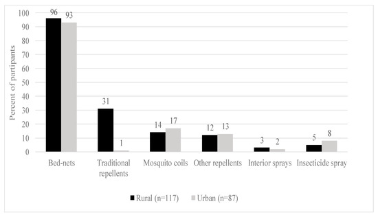 A substantial number of both male and female participants generally appear to have adequate knowledge of mosquitoes and malaria transmission, and the trend is similar for participants residing in both rural and urban villages (Table 3). This high awareness is a confirmation of high priority and investment that SSA countries have had towards controlling malaria. About 94% (in rural) and 80% (in urban) of the participants correctly stated that mosquitoes bite both humans and animals. Regarding the seasonality and mosquito abundance, about 79% correctly stated that mosquitoes are mainly abundant during the rainy season. Similarly, about 74% of the rural-based participants and 76% of the urban participants mentioned stagnant water pools as the main breeding sites for mosquitoes. Regarding mosquito biting time, 63% of the participants were aware that nighttime is the biting time of mosquito. A good number of the surveyed households (52%) identified indoor dark areas as the resting places of mosquitoes during the day.