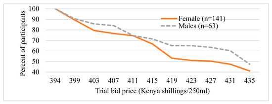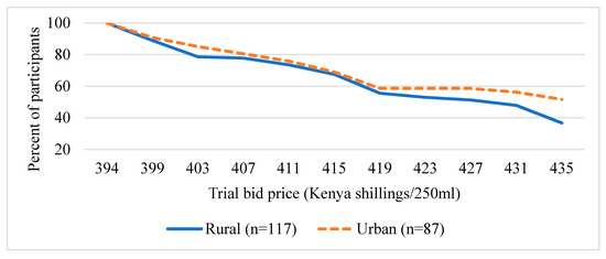 Figure 3 and Figure 4 present the distribution of the trail bid prices (presented during the survey) the participants are willing to pay for UZIMAX. The results show a high potential demand for bio-pesticide when supplied to the market. As can be seen in the figure, all participants were willing to pay at the lowest bid price of Kshs395 (about US$3.95) for 250 mL of the biopesticide. Their WTP for the biopesticides would be offset by the economic and health gains, the reduction in expenditure on insecticide and the environmental and human preservation accruing from the technology. As expected, results are consistent with economic theory. The willingness to pay declined with increase in the bid price for the bio-pesticide. The downward sloping WTP curves resemble demand curves where there tend to be more unwilling participants as the bid prices increase [45,46,47]. The results also show that more males were willing to pay higher bid prices relative to their female counterparts (Figure 3). Similarly, more urban-based participants were willing to pay higher prices than those in rural areas (Figure 4). These results, especially for gender, have been consistent across several studies. A systematic review and meta-analysis of willingness to pay values on malaria control interventions by [44] revealed that gender of the participants was a consistent and significant positively related factor, revealing a higher willingness to pay among male survey participants. Most literature points to differences in access to financial resources between males and females and between rural and urban residents as well as differences in access to medical/health information as the main causes of the differences.