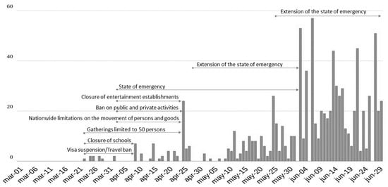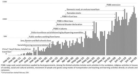 As the pandemic particularly puts the livelihoods of poor and informally employed people at risk, Indonesian farmers could be disproportionally affected. After initially downplaying the crisis and underreporting cases and deaths, the Indonesian government implemented a strategy to mitigate the economic downturn, including putting “large-scale social restrictions” in place and signing them into law on 31 March 2020. This regulation allowed local governments—districts or cities—to restrict the movement of individuals and goods within a region upon approval of the Ministry of Health. Local governments were, therefore, able to choose systems that they felt best suited local needs with restrictions ranging from no limitations of movement to quasi-lockdowns and strict stay-at-home orders. Importantly, the most severe restrictions occurred during Eid al-Fitr (Idul Fitri), which prevented internal migrants from visiting their families. A timeline of new infections and government response is provided in