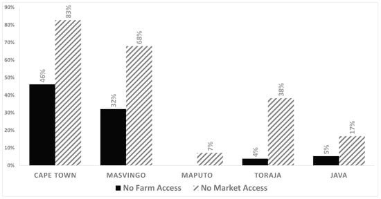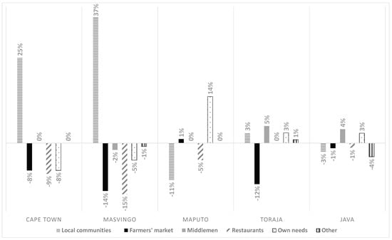 Figure 8). In Cape Town, township communities and neighborhoods were the main markets for farmers during the lockdown as well as, to a lesser extent, restaurants and vegetable box schemes. Local community markets were viewed as important by more women farmers (47 percent) than men farmers (20 percent) before lockdowns. In Maputo, local markets via intermediaries made up more than 90 percent. In Toraja, the farmers market was the primary market, followed by local communities. In Java, intermediaries represented one third of the market, with local communities at 26 percent, and farmers markets at 23 percent.