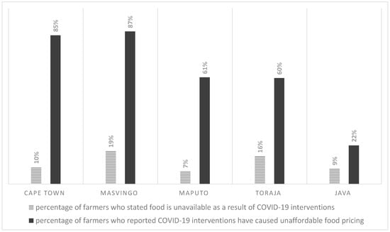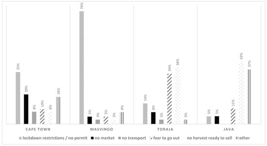 A similar dynamic was observed in farmers’ ability to sell their products. Cape Town and Masvingo farmers were the most affected by market disruptions, making it impossible to sell their produce. Farmers in Maputo and in the two Indonesian regions were the least affected by marketing disruptions as they continued to sell to local communities; in fact, local demand increased as food imports from South Africa were restricted.