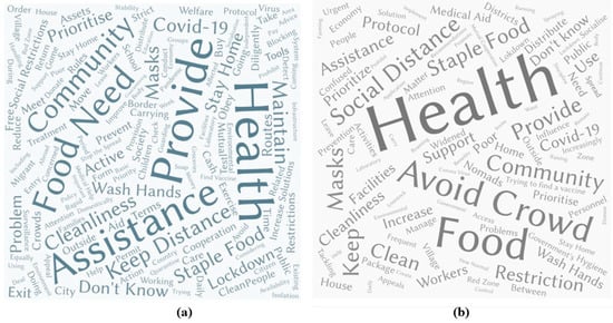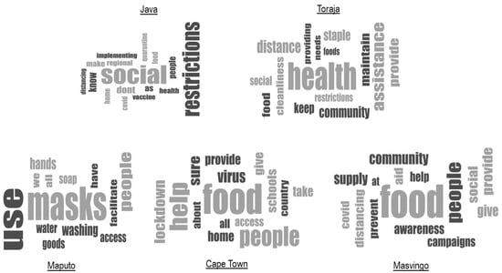 The co-researchers applied another approach to assess the pandemic’s impact on farming activities, farmers’ livelihoods, and farmers’ frustrations during the initial phase of the pandemic: they asked farmers the hypothetical question, “If you were ‘the Minister of COVID-19’ in your country, what priority policy action would you take to handle the pandemic in your community?” Strikingly, in all five regions, there were very few differences between the stated visions of women and men. The main priorities were food relief and the impeding hunger crisis in Cape Town and Masvingo; the fear of infections and demand for protective equipment such as face masks and soap in Maputo; and social restrictions, border closures, and health system support in Indonesia, where their opinions are influenced by their close proximity to China and prior experience with SARS. The word clouds below (