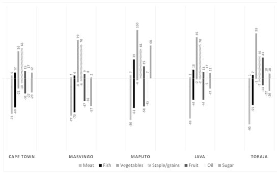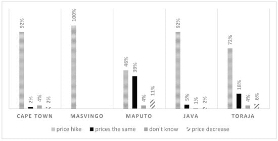 Unlike all southern African study areas, the Indonesian government distributed food aid to Indonesians, with 74 percent of Toraja farmers and 47 percent of Java farmers reporting they received government food parcels. Lower participation in Java was due to limited supplies spread over a higher population in Java. Despite this, farmers reported that price increases for all foods surpassed 50 percent, with fruit price increases reported by 94 percent of respondents. The consumption fell sharply as a result, which was similar for fish and meat. These food groups are mostly distributed by brokers and retailers and rarely sold by farmers themselves. Over the study period, Javanese farmers reported using traditional food markets like local vendors and farmers markets 5 percent less frequently each.