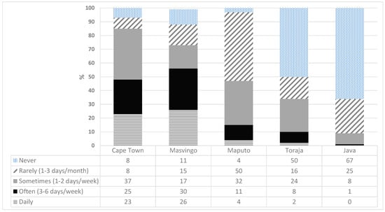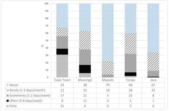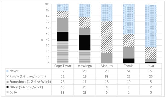 48]. Women also applied more coping strategies in three of the four studied food regions. Although women in Cape Town were less able than men to gain permits to access their farms, because their domestic duties limited their time to complete the application process, they initiated a network to grow seedlings to address shortage of inputs during the lockdown. In Masvingo, women farmers ensured that seeds were available for the upcoming planting season. For example, they organized a WhatsApp swap with other women farmers, established kitchen gardens during the lockdown (an additional activity to their farm work), and limited their daily food portions. In Indonesia, while men are the official household head and government assistance is directed at them, women are responsible for bringing family meals to the table and felt extra pressure to maintain this task during the social restrictions. Therefore, women sought to creatively seek solutions to overcome the food supply problem for their families. Women increased vegetable production in kitchen gardens, particularly their own family’s consumption.