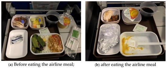 Firstly, the visual research method photo-elicitation [46] was used for collecting participants’ airline food waste, which helps the researcher to know passenger’s in-flight catering experience by observing if food wasting behaviour happens. The photograph provides a visible record of participants’ real-life experiences and it helps problem to be exposed and explored by the researcher of the study. Photo-elicitation is especially feasible when participants–researcher communication restricts by the time and location. More importantly, the strength of using this approach is adding to the credibility of the data, which ensures the reliability to a qualitative research [47]. In this study, participants were required to take photographs of their airline meals before and after being eaten. According to participant-produced photographs, food waste generation and category can be clearly identified. Figure 1 presents an example of participant-produced photographs as a technique for data collection.
