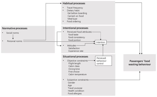 This study has identified that factors influencing passengers’ food wasting behaviour can be categorised into four themes based on the four processes of the Comprehensive Action Determination Model (CADM) [24] (p. 55). Each theme has listed specific factors that have an impact on passengers’ food wasting behaviour by analysing passengers’ responses in the survey.