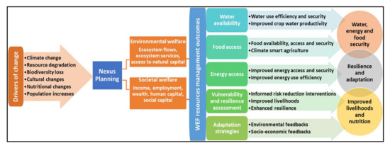 Therefore, the focus is on (a) the drivers of change, (b) risk and exposure, (c) nexus planning, and (d) resource security. The drivers of change (both socio-economic and environmental) affect resource availability, accessibility and their productivity [22], and thus determine community vulnerability and resilience, or formulation of adaptation strategies. Knowledge of these interactions is critical for providing transformative pathways towards sustainable socio-economic development. The study is concerned with defining, measuring and modelling progress towards sustainable development, through a set of indicators formulated around resource utilisation, accessibility and availability [10]. The knowledge-based tools provided the WEF resources management outcomes.