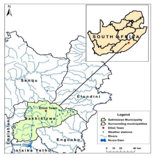 Sakhisizwe Municipality is an administrative area in the Eastern Cape Province, South Africa, located at 26°41′ S, 30°55′ E (Figure 2), with an area of 2556 km2. It is comprised of gently undulating “table land” forming the Drakensberg foothills, with elevation ranging between 750 m and 2600 m [23]. The rocky and undulating landscape makes it difficult for smallholder farmers to be productive and be food secure. The highly variable elevation shapes the soil types, where low areas are dominated by clay soils that are highly erodible, but the hills in the surrounding areas are made up of strong lithosols [23]. It receives an average annual rainfall of between 600 mm and 1000 mm.