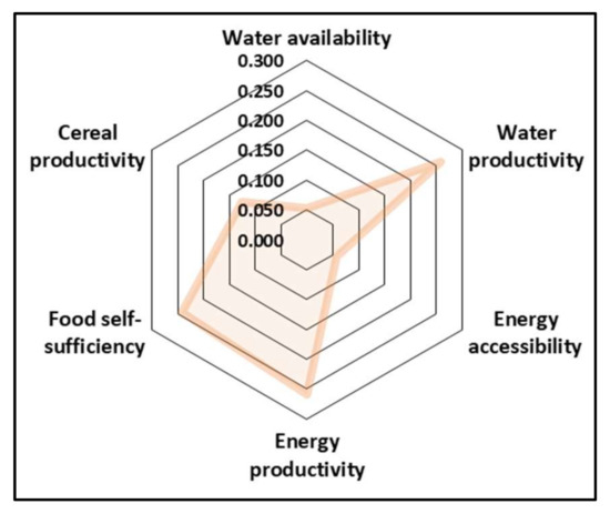 There is an evidently better water productivity and energy productivity (both at 0.259) in Sakhisizwe Municipality, followed by food self-sufficiency (0.243). The better water productivity in the municipality could be motivated by limited water resources or low water availability (0.053), which often results in water being used sparingly and efficiently. This is a general trend in the whole of South Africa as the country is water-scarce [10]. Although energy production is high, accessibility is still very low at 0.058, as 21% of the population has no access to electricity. The situation is worsened by depleting water resources due to drought and compromises hydro-electricity generation, which is the main source of energy [23]. The effects of drought also highlight low water availability in the municipality, which affects energy accessibility and cereal productivity. Water management is an area that still needs to be improved in the municipality to ensure water, energy and food security, as 61% of the population live in the rural areas and are highly vulnerable to climate change impacts [23]. Overall, an integrated composite index of 0.185 classifies the municipality into a marginally sustainable category.