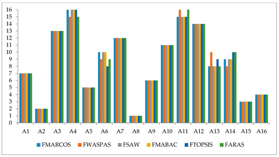 Sensitivity analysis was performed in two ways. The first way was focused to compare the results obtained using the fuzzy MARCOS method with the other five fuzzy methods, namely: simple additive weighting (SAW) [30], weighted aggregated sum product assessment (WASPAS) [30], multi-attributive border approximation area comparison (MABAC) [26], additive ratio assessment (ARAS) [30] and technique for order preference by similarity ideal solution (TOPSIS) [31]. Another way was focused to change the weights of the criteria and the impact of these weights on the ranking order of the alternatives [32].