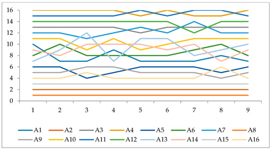 The first way of conducting sensitivity analysis has aimed to show the sensitivity of the ranking order based on the use of different methods of multi-criteria analysis. The results of this method of conducting sensitivity analysis examined the obtained results of the primary method used in the analysis. The results of this sensitivity analysis have shown that the ranking order of the first seven alternatives have been the same by applying any fuzzy method (Figure 2). The correlation between the ranking orders of alternatives using different fuzzy methods was examined using the Spearman correlation coefficient (SCC) [33] (Table 9).