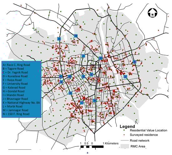 Transaction data recorded at the land registrar’s office in Rajkot does not include the grey market component, which can be a sizeable and spatially varying amount []. Therefore, to get an accurate picture of land values, the data on land value were collected from prominent builders, developers, and brokers with the help of the Rajkot Builders Association (RBA). Land values (estimated transaction price for a brownfield site (excepting some undeveloped peripheral locations)) for 335 point locations across the city were noted on the city map. While marking these points, care was taken to cover all land value variations. In Figure 2, these are shown as green dots.