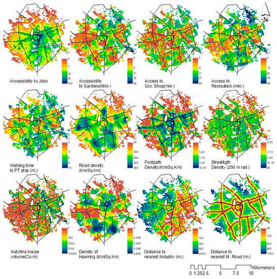 The data used were collected for the Low-Carbon Comprehensive Mobility Plan (LCMP) Rajkot study []. The household survey used was conducted in the year 2012 and was for 2848 households, and their dwellings spread across the city. For each unit, the data contained information on how far and for how much time the residents travelled to access essential services. These travel time values captured in the household survey were interpolated using the inverse distance weighted (IDW) method in ArcGIS®. The IDW method used power function (2), and the eight nearest neighbours for interpolation. The interpolated data were validated using a portion (10%, 285 points) of the survey data (not used for interpolation exercise). The interpolated results showed good and statistically significant correlation with the observed data (walking time to shopping (R2 = 0.82), walking time to recreation (R2 = 0.94), walking time to gardens (R2 = 0.76), walking time to bus stops (R2 = 0.85)).