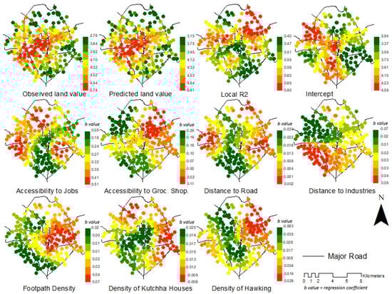 In the global regression model, the value is constant for all places in the city. However, in the land value analysis, these parameters may themselves be a function of geographic location and strength, and the form of relationship can be different over space. For the GWR model, the varies across space and overcomes this limitation []. Essentially it measures the linear regression at every data location with varying regression coefficients. ArcGIS® is used for GWR analysis, and the regression equation can be written as: