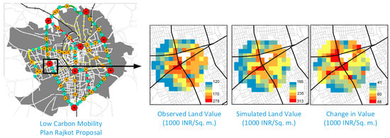 Figure 5 shows the location of the zone considered for this exercise in red in the square box, the observed land value, the simulated land value, and the change in land value in each grid cell. Implementation of TOD results in a significant increase in the land values in the zone, in the range from INR 41,000/m2 to INR 88,000/m2; if we convert this into a total increment in land value it amounts to INR 702.4 million (around USD 9 million) in a 1.18 km2 area. The increase in value is around sevenfold. Similar gains have also been observed with a land readjustment method used to convert rural land to serviced urban land []. This example of a TOD development zone in Rajkot might not have a similar impact on land value in other areas. However, it can be inferred that investment in transport infrastructure can result in a substantial gain in land value. Part of this land value increase can be captured as betterment charges, as in town planning schemes in the Gujarat state [].