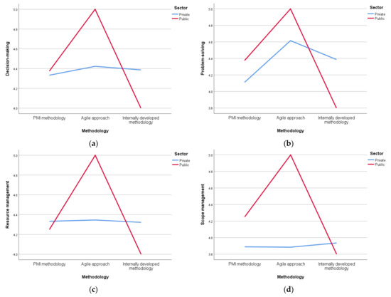 The need for knowledge and skills, depending on the sector and methodology type: (a) Decision-making, (b) problem-solving, (c) resource management, (d) scope management.