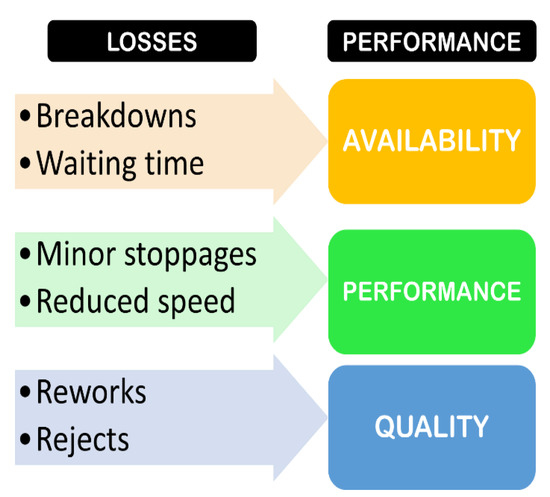 In regard to wastes, this article, oriented toward machines, has chosen the concept of the six big losses developed by Nakajima as the lean tool to establish this KPI. Losses are defined as activities that consume resources without value addition [29]. Nakajima categorizes these losses into three big blocks, i.e., time, speed, and quality loss, described as follows (as can be seen in Figure 2) [30].