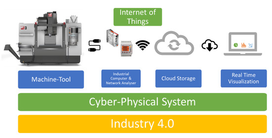 The second step is the integration of Industry 4.0 technologies, which are applied to a machine tool, into a cyber–physical system, allowing us to obtain real-time data on factors such as energy consumption for calculations of a machine tool KPI.