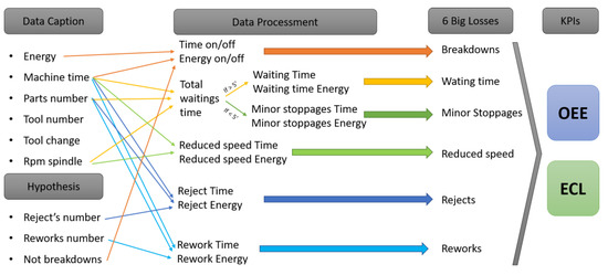 As the origin of both indicators is the six big losses, the data collected from the machine tool can be processed as time losses for the calculation of the OEE (see Table 2) at the same time that they are processed as energy losses for the ECL (see Figure 5).