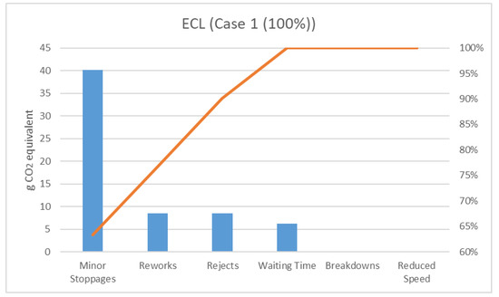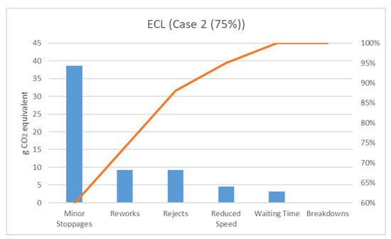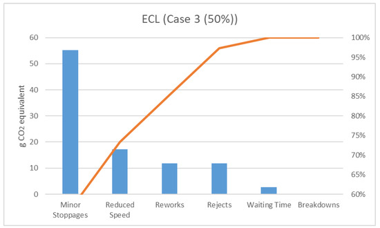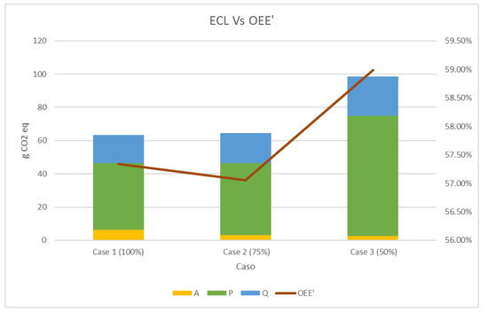 Figure 11 presents a comparison between the OEE (%) and ECL. It can be observed that case 2 shows the highest percentage of OEE; however, it does not correspond to the lowest ECL. In contrast, case 1 shows the lowest ECL and a lower percentage of OEE. With these results, it can be concluded that having a larger OEE does not conditionally signify the most sustainable productive method.
