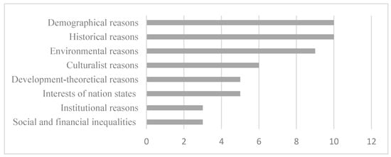 After receiving information on the actual global distribution, the possible reasons for the imbalance were discussed by the participants. Despite group-specific differences, the presumed reasons for the imbalanced global distribution of WCH showed cross-cutting tendencies. Decisive for the assumptions of most participants was the idea of Europe as an outstanding haven of culture, history, and progress. As shown in Figure 2, the groups predominantly referred to demographic, historical, and environmental reasons, while power relations (institutions, and social and financial inequalities) were mostly neglected.