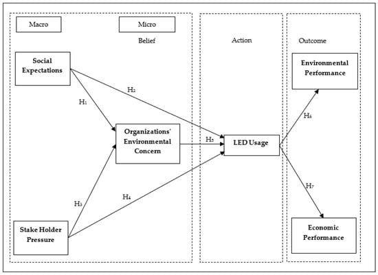 Previous studies have found that social expectations have a strong influence on organizations’ green practice. For instance, Lee et al. [6] found that perceived social expectations of employees and top management had an impact on organizations’ adoption of environment responsible activities and green practices. Despite this, social expectations may vary between developed and less developed countries. High social expectations in developed countries demonstrate organizations’ greater involvement in environment friendly activities, as compared to less developed or emerging economies [31,32]. This implies that the investigation of social and environmental responsibilities of organizations in such countries require more scholarly attention [32]. It had been noted that organizations which operate under the social contract theory may perceive environmental or socially responsible activities as part of social expectations. Claims had also been made that social expectations may be the trigger motivating organizations towards developing more positive environmental concerns. However, social expectations may not explain organizations’ complete involvement [30] which may include actual usage of energy-efficient technology like LED, thereby improving environmental sustainability. Based on the above statements, this study was conducted to empirically examine the role of social expectations on organizations’ environmental concern and organizations’ actual usage of LED. Based on this, the following hypotheses were formulated: