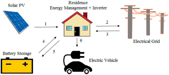 Energy generated by the PV array flows to the residence, which houses the energy management system and all the necessary power electronics, including the inverter.