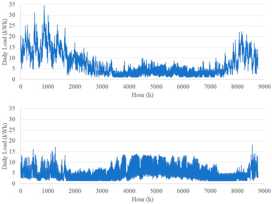 Figure 2 shows the plots for both locations, NYC and PHX. This data is also hourly, for every hour of every day of the year, and was taken to be representative of each year in this study. The spreadsheet data provides a breakdown for each type of load (electric heating, gas heating, fans, appliances, etc.). All the loads were added to come up with one total energy demand for each hour (kWh). Thus, the tacit assumption is that each residence is 100% electric with no gas consumption.