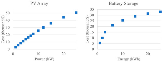 Figure 4 shows a scatter plot of the estimated capital and maintenance costs for the PV array and battery storage. A 1-D interpolation function was used to look up values from these plots.