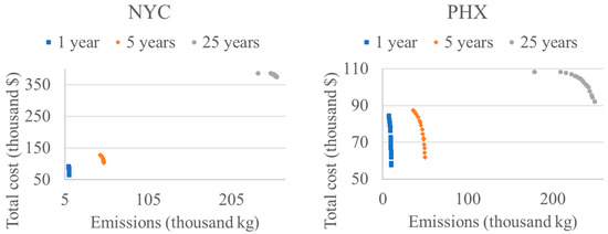 Figure 5 for both locations and for several time periods: 1 year, 5 years, and 25 years. A classic Pareto front was obtained. For both locations, the shape of the front is nearly identical and changes in the same way for increasing time periods (