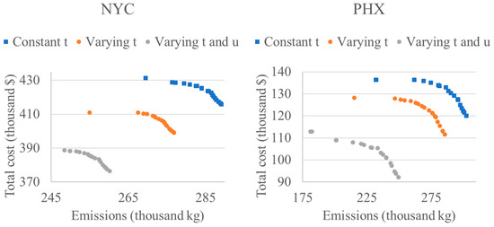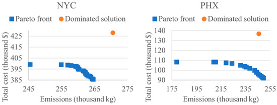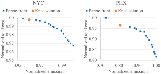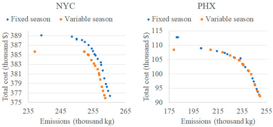 Table 5. The values are very similar because of the overlap between the fronts. For both locations, the variable season front covers more of the dominated space, ~6% more in both cases. However, the fixed season front is more uniform by ~2% in both cases. Thus, while using a fixed charging time during the year produces a Pareto front with a better distribution, it is clearly dominated by the strategy that has a seasonal charging time. For NYC, the summer-winter transition ranged from 3471 h to 3767 h and for PHX, it ranged from 2609 h to 2667. An earlier transition for PHX is to be expected given the climate and the insolation there in April compared to in NYC.