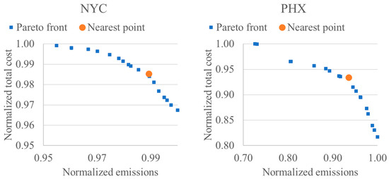 24]. Here, the optimizer picks an optimal solution that has the least geometric distance to some reference point, like the ideal point. For a min-min problem, the ideal point is the origin (0, 0). In practice, no solution will produce emissions and total costs that are both zero. However, a point on the Pareto front that is nearest to this point may be considered the most optimal. Again, normalized fronts were used, and the result is shown in