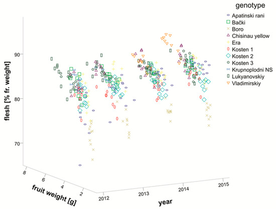 In order to observe and present patterns of the most important fruit characteristic, namely fruit weight and flesh content, it is presented (Figure 1) throughout the years of research.