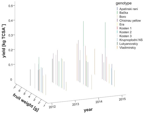 Genotypes significantly (p = 0.006) differ in yield efficiency (Table 2). For better visualization of the agronomical traits important to the yield, i.e., yield per TCSA and fruit weight data is presented in combination as measured in the years of study (Figure 2). The best genotypes are Vladimirskiy, Chisinau yellow and Krupnoplodni NS characterized with consistently higher yield and large fruit. Good yield and good-sized fruit are measured also in local genotype Kosten 3 and Bačka. Genotype Boro had consistently the lowest yield with the smallest fruit.