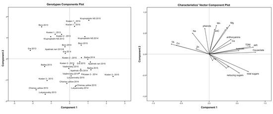 Krupnoplodni NS, Kosten 1, and Boro represent group of genotypes with consistently higher to medium biochemical content. Those genotypes are grouped along the positive part of the second principal component for all years of study.
