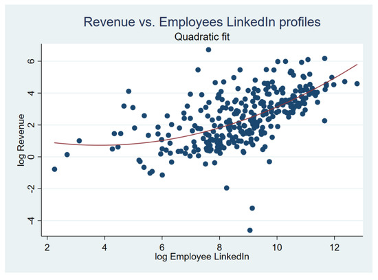 Figure 1 depicts the scatter plot of revenue vs. employees (in logs) and the quadratic fit regression line. It is readily seen how the positive relationship between employees and revenue catches early on the data (231 employees or 5 in logs), and only for a few firms in the left tail of the employee distribution is this relationship less positive.